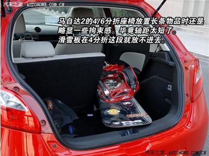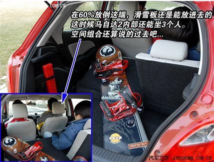 放在60%分折这边,马自达2还是可以容纳下一个滑雪板的,空间组合可以算是成功。这时候,还可以乘坐三个人(如上图所示)。这么小的车,容纳下三个人出行的滑雪装备不成问题,给予表扬。如果硬要说出些问题来,也许就是后排乘客只能乘坐在那40%的座椅位置上了,自由略微受限一些。