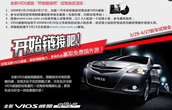 全新威驰简酷登场,领略全所未有的简酷风潮,发现无处不在的简酷之美,尽在江北展通丰田全新VIOS威驰试驾会,试驾即可获得陈坤CD音乐套装,更有机会与好友一同免费国外游!