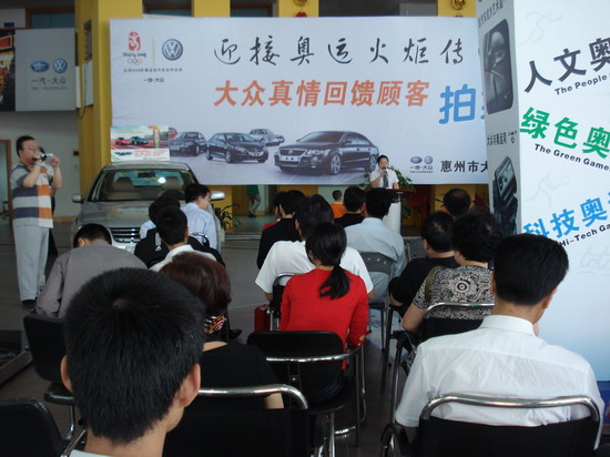 4月12日上午,惠州大众4S店在其位于汽车大市场的展厅内举行了"迎接奥运圣火,大众真情回馈"新车拍卖会。在主办方的精心组织下,拍卖会吸引了数十位客户以及惠州各大媒体人员参加,并成功拍卖出八辆新车。