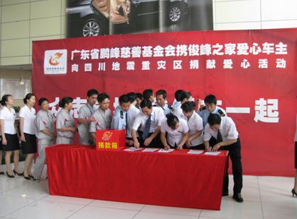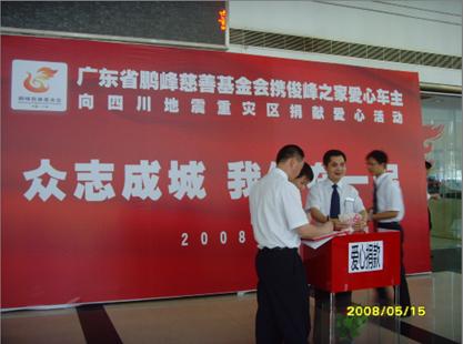 作为社会大家庭中的一员,鹏峰集团及旗下俊峰汽车一向致力于社会公益事业,据不完全统计,鹏峰集团成立10年来,在慈善、公益、拥军等方面累计捐赠超过1000万元,今年3月广东省鹏峰慈善基金会的成立,更表明了鹏峰将慈善公益事业进行到底的决心。鹏峰集团总裁助理张俊峰表示:"作为中华大家庭的一员,我们心与灾区人民紧紧相联。我们会密切关注事态发展,了解国家救灾工作遇到的问题和需求,尽我们所能去帮助灾区人民,大家一起共度难关。我代表全体鹏峰人向在地震中遭遇不幸的罹难者表示深切的哀悼,向受灾人民致以诚挚的问候!我们相信灾区人民一定会战胜这次地震带来的灾害,重新建立美好的家园!"