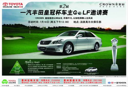2008年7月18日,由一汽丰田汽车销售有限公司主导的第二届“CROWN皇冠杯车主GOLF预选赛”将在惠州挥杆开赛!