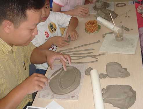 家庭陶艺小竞赛分陶艺制作比赛(手工制作)和拉坯比赛。到场参加陶艺竞赛的都是亲子团,大人小孩一起做陶艺,其乐融融。