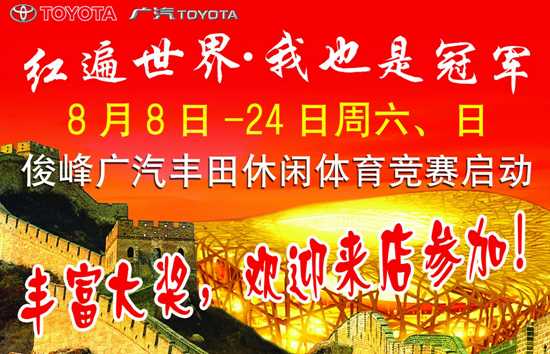 为响应“提高全民素质”的号召,庆贺中国举世瞩目的成绩。俊峰广汽丰田于8月8日在展厅启动“红遍世界•我也是冠军”的休闲体育擂台赛,每周六、周日进行。赛事以看板的形式将成绩公布于众,并欢迎各位朋友挑战擂台,不断刷新记录,一直持续到8月24日结束。俊峰广汽丰田为赛事设置了丰富大奖,包括山地自行车、皮划艇、野营帐篷、登山背包、野营炉具等专业的户外旅游装备。