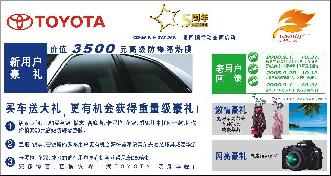 活动三:老客户在9月1日至10月31日活动期间到俊峰一汽丰田店可享受:1、保养套餐,工时费8折;2、轮胎,零件费9.5折;3、蓄电池,零件费9折;4、更新专用DVD导航光盘;在9月22日-10月12日期间可享受爱车免费检查、刹车片,零件费9折、更有精美礼品赠送。