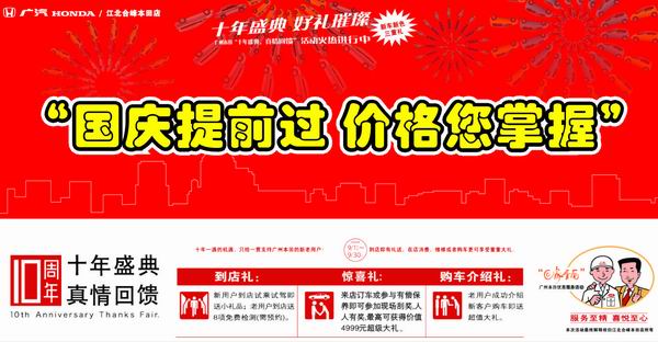 据悉,国庆黄金周同时也是广州本田“十年盛典,真情回馈”暨合峰周年庆的感恩回馈的日子,为庆祝十周年店庆,江北合峰本田店特在9月20-21日(周六、日)举办“国庆提前过 价格您掌握”活动。详情可致电或到现场咨询