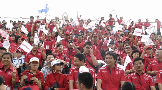 10月19日,F1大奖赛上海站的比赛正在上海国际赛车场内激烈进行。看台上,一个由200多人组成的方阵尤其引人注目,他们统一着装红白相间的Honda赛车服,为Honda车队加油,为所有全力拼搏的车队加油。