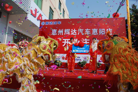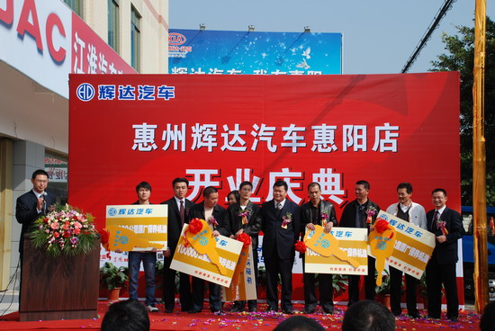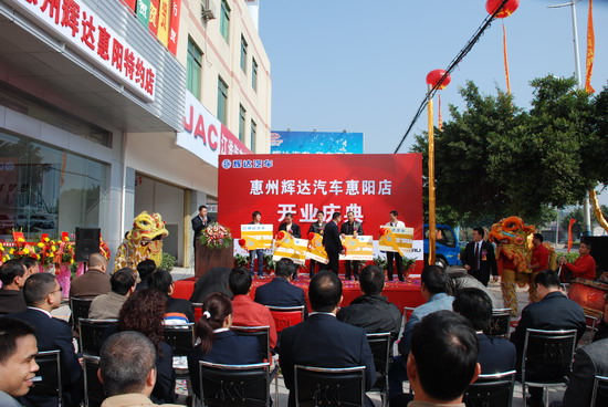 在开业庆典仪式上,惠州辉达汽车董事长李光辉先生为店牌揭幕,活动现场礼花漫天飘舞,鞭炮雷鸣,嘉宾的掌声阵阵,现场气氛热烈,呈现一派喜气洋洋景象,精彩的醒狮表演更为此次活动配上了美丽的音符。据介绍,在惠州辉达汽车惠阳店试业短短一周的时间里,该店便产生了六位新车主,其中一位车主特意选在这个喜庆的日子订车。庆典活动特意为这6位车主进行隆重的交车仪式,并现场赠送100000公里原厂保养机油。