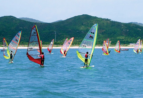 当天天气依旧酷热,沙滩上更是蒸炉一般。而海面上运动们却顶着烈日迎风破浪,只见他们脚踏板体,手持帆杆,不断摇动调节方向,借着海风顺着航道疾驰前进。远远看去,像一片片五彩的叶子在海面上嗖嗖地划过,穿梭晃动,让人分不清谁是谁。由于海面环境比较好,风浪平稳,比赛进行得很顺利。不到下午5时,运动员们就陆续上岸。