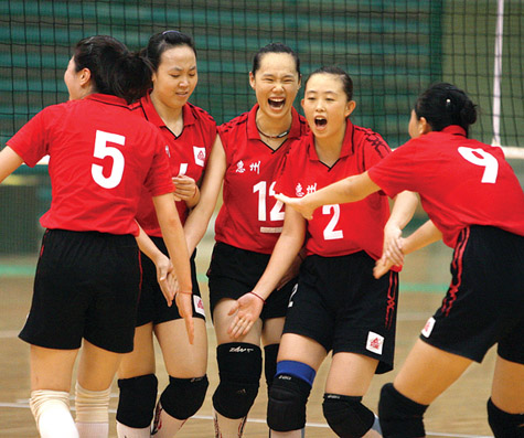 惠州女排姑娘在决赛中庆祝扣球得分。 本报记者王剑桥 摄