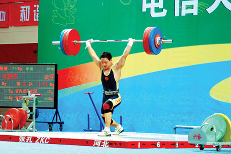 昨日(11日),广东省第十三届运动会“电信天翼杯”男子举重比赛开赛。当日比赛共产生4块金牌,云浮队斩获两金,该市选手沈德芳打破男子甲组69公斤级省运会纪录;惠州市选手李林君获得男子甲组62公斤级比赛铜牌。在男子甲组77公斤级比赛中,深圳选手刘飞广获冠军,广州选手冯玉斌获亚军,两人都打破省运会纪录。(本报记者黄文韬 特约通讯员黄伟光 摄)