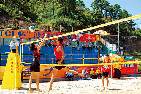 12日,广东省第十三届运动会“TCL杯”男子沙滩排球比赛在惠东县巽寮湾展开第二轮的角逐。在12日的比赛中,惠州队和深圳队分别战胜广州队和汕尾队。惠州队获得开赛以来的两连胜。